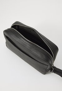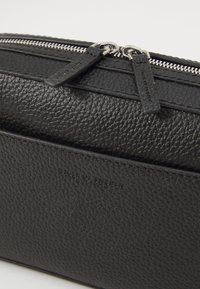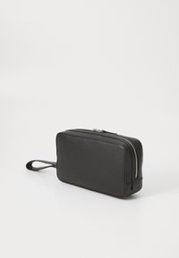 Czarny skórzany portfel o teksturowanej powierzchni, z zamkiem błyskawicznym, przednią kieszenią i odczepianym paskiem na nadgarstek. Kompaktowy, prostokątny kształt.