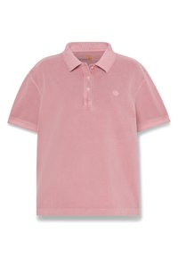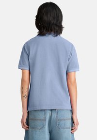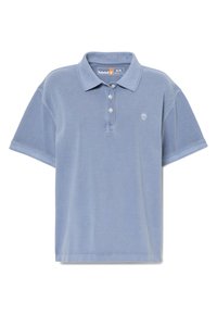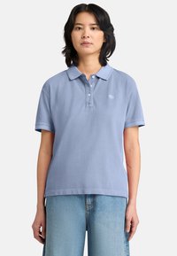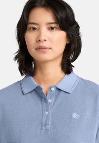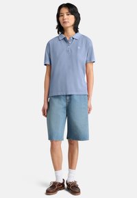 Kobieta o ciemnych, średniej długości włosach, ubrana w jasnoniebieską koszulkę polo z krótkim rękawem i jasnoniebieskie dżinsy, stojąca na białym tle.