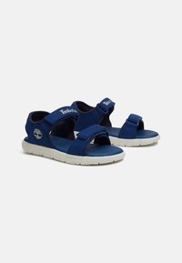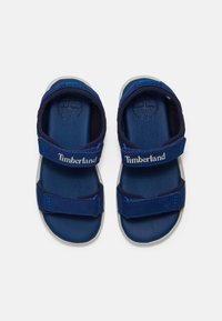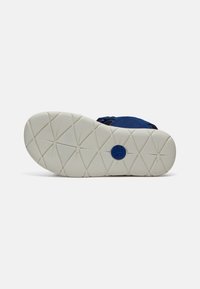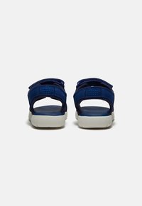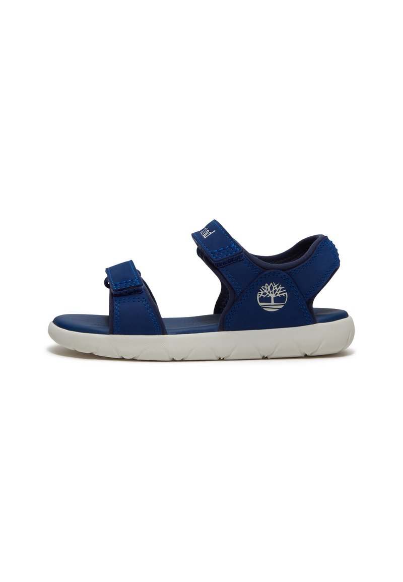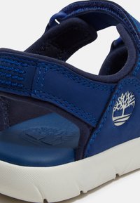 Granatowy sandał na otwartym palcu z regulowanymi paskami i białą, miękką podeszwą, z logo drzewa na bocznym pasku.