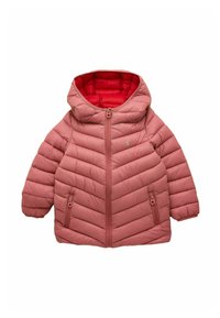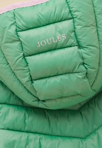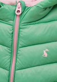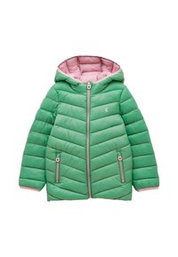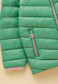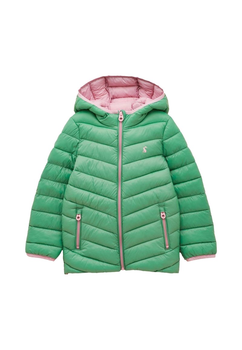 Zielona puchowa kurtka dla dziecka z różową podszewką, kapturem i różowymi detalami zamka, z małym zwierzęcym logo na klatce piersiowej.