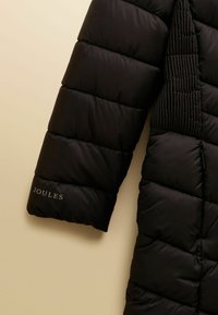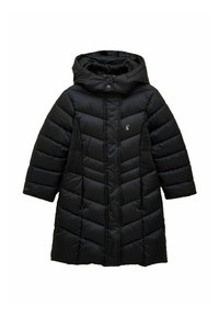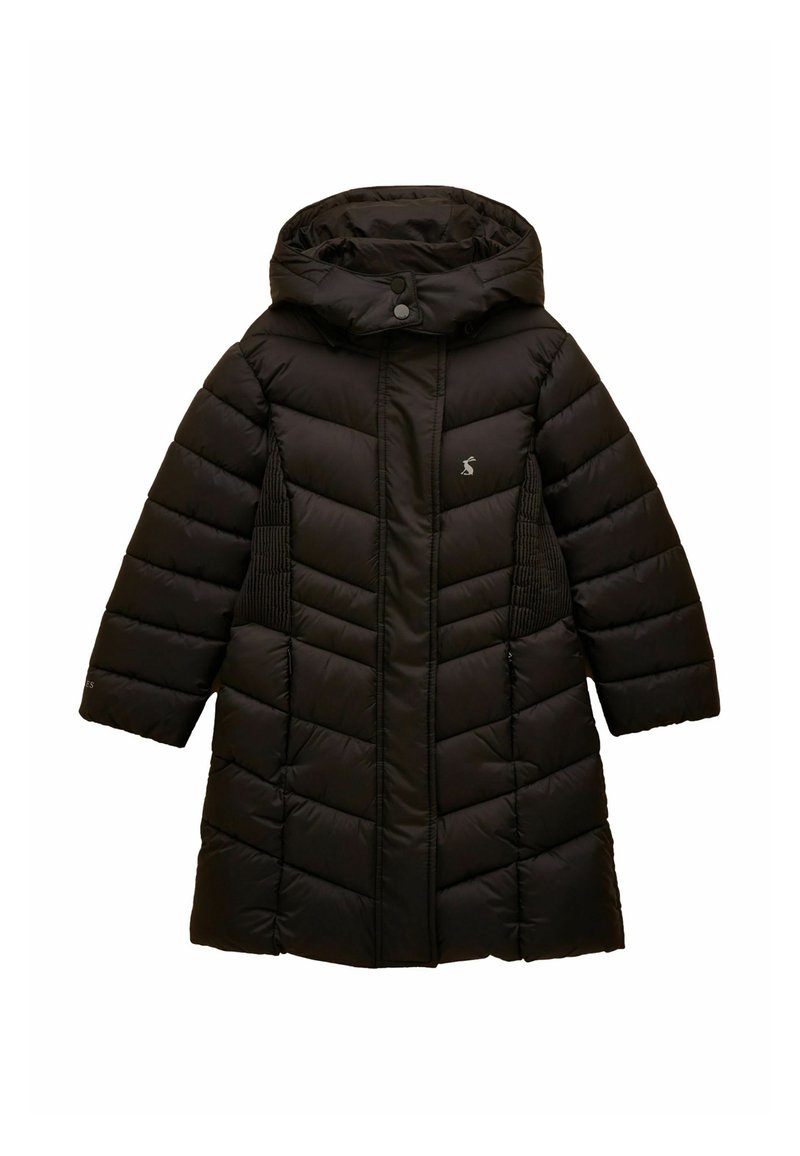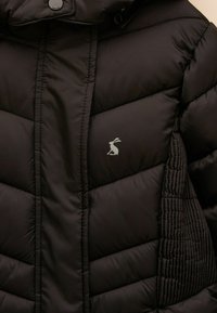 Czarna długa pikowana zimowa kurtka z kapturem, z przodu zamek błyskawiczny, zapięcie na zatrzaski oraz boczne paneli z prążkowanego materiału dla lepszego dopasowania.