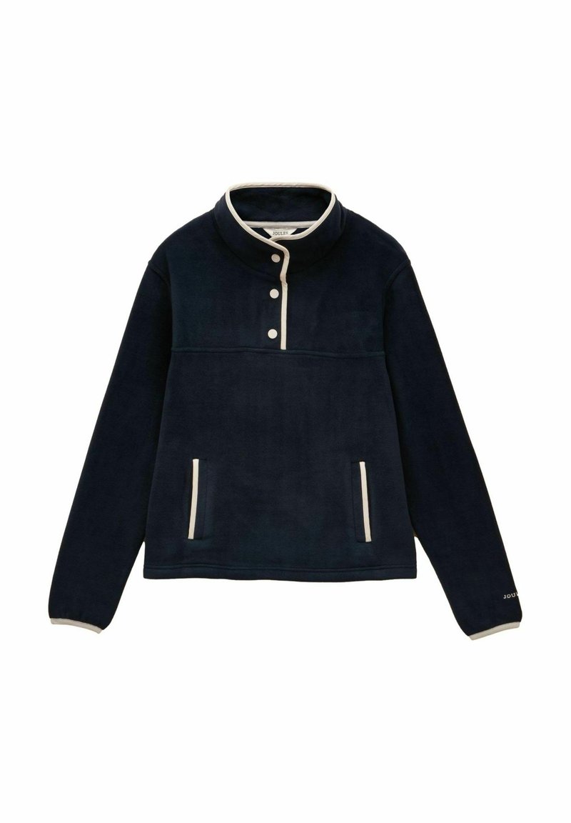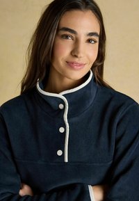 Granatowy polarowy pulower z kremową lamówką, trzyguzikową patką, stójką i dwoma przednimi kieszeniami na zamek.