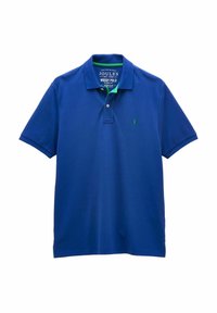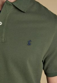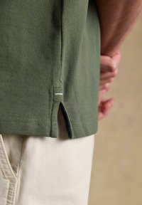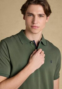 Młody mężczyzna w oliwkowo-zielonej koszulce polo z krótkim rękawem i beżowych spodniach, stojący z rękami w kieszeniach na białym tle.