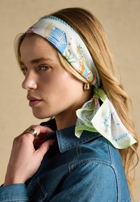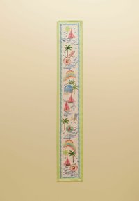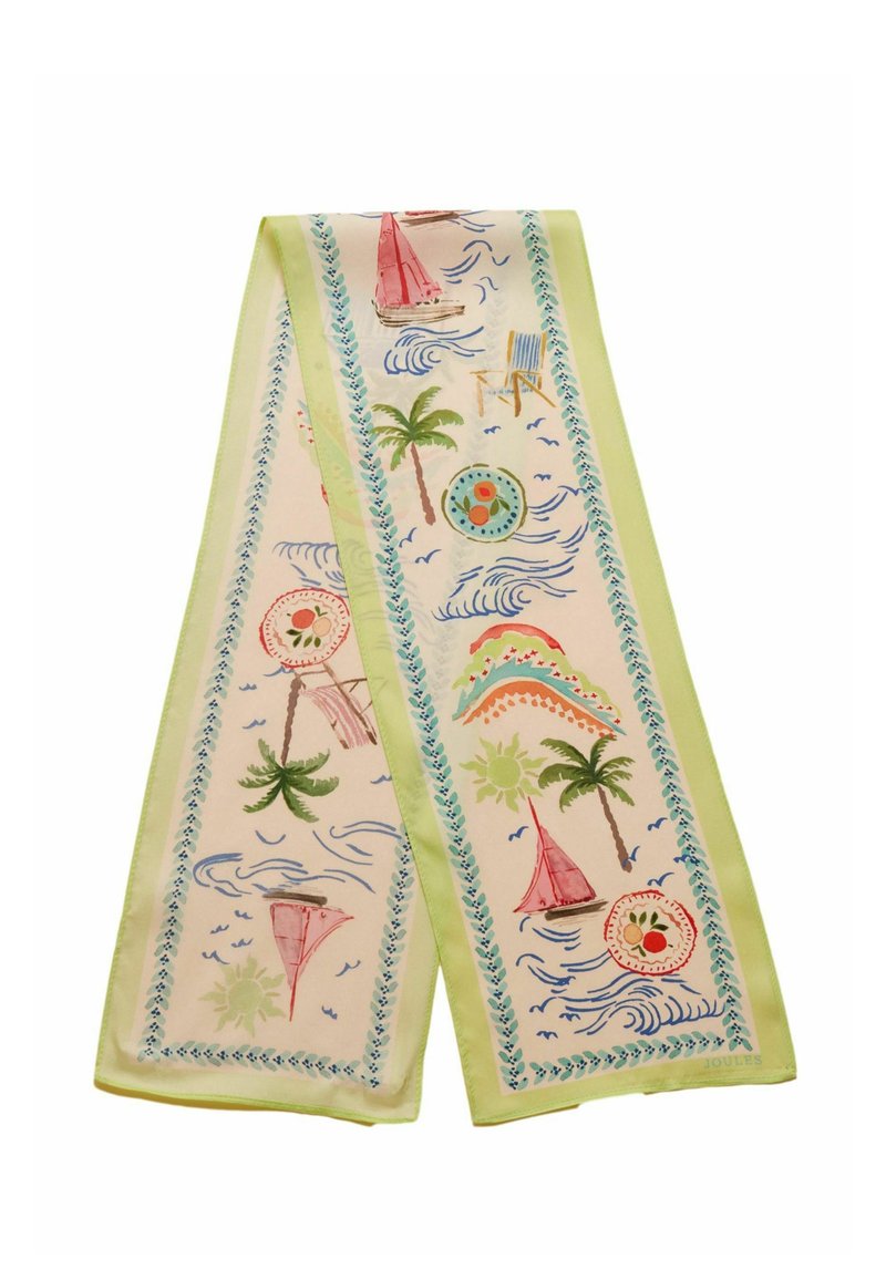 Chusta z zieloną obwódką, przedstawiająca żaglówki, palmy, leżaki, słońce, fale i parasole w kolorowym, ręcznie malowanym stylu na kremowym tle.