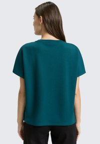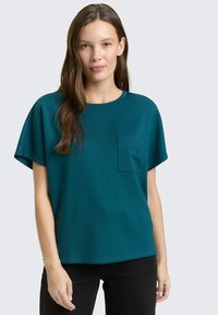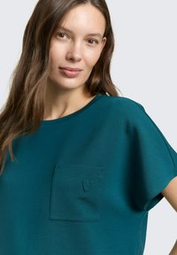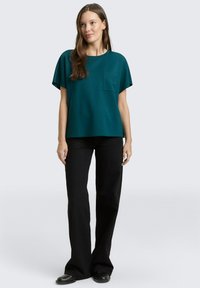 Kobieta o długich brązowych włosach, ubrana w morski, krótkim rękawem koszulę z przednią kieszenią oraz czarne spodnie, stojąca na jasnym tle.