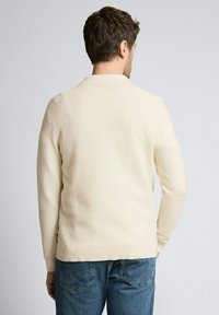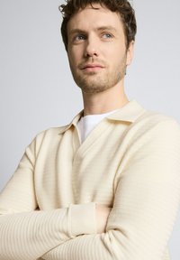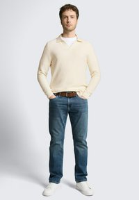 Mężczyzna o kręconych włosach, ubrany w kremowy sweter z dzianiny na białej koszuli i niebieskich dżinsach, stoi z jedną ręką w kieszeni na białym tle.