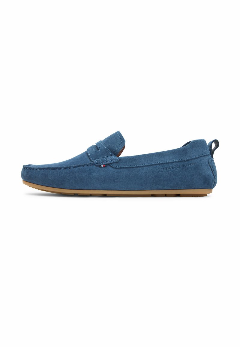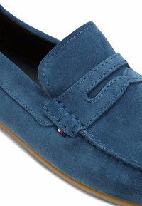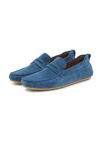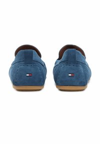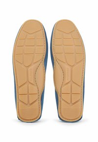 Niebieska mokasyna zamszowa z brązową gumową podeszwą, przeszyciem w stylu mokasynów, małą metką z logo i pętelką na pięcie, widziana z boku.
