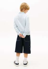 Młody chłopiec w jasnym sweterku, ciemnych szortach z denimu, granatowej czapce z daszkiem i trampkach, stojący ze złożonymi za plecami rękami na białym tle.