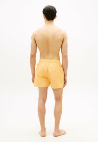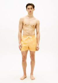 Młody mężczyzna z krótkimi ciemnymi włosami, ubrany w pomarańczowe kąpielówki z białym sznurkiem, stoi z rękami w kieszeniach na tle jasnej, jednolitej ściany.
