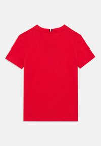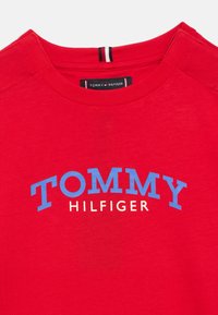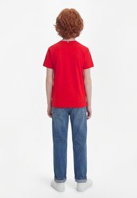 Rudy chłopiec uśmiechający się, ubrany w czerwoną koszulkę Tommy Hilfiger, niebieskie dżinsy z mankietami oraz białe buty wsuwane, stojący na białym tle.