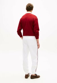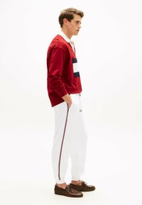 Mężczyzna w białych spodniach dresowych ze ściągaczem, połączonych z brązowymi skórzanymi butami sznurowanymi, stoi na białym tle.