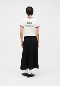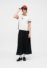 Osoba ubrana w czarną spódnicę midi, białe skarpetki, czarne mokasyny i biały top z czerwonymi i czarnymi paskami po bokach.