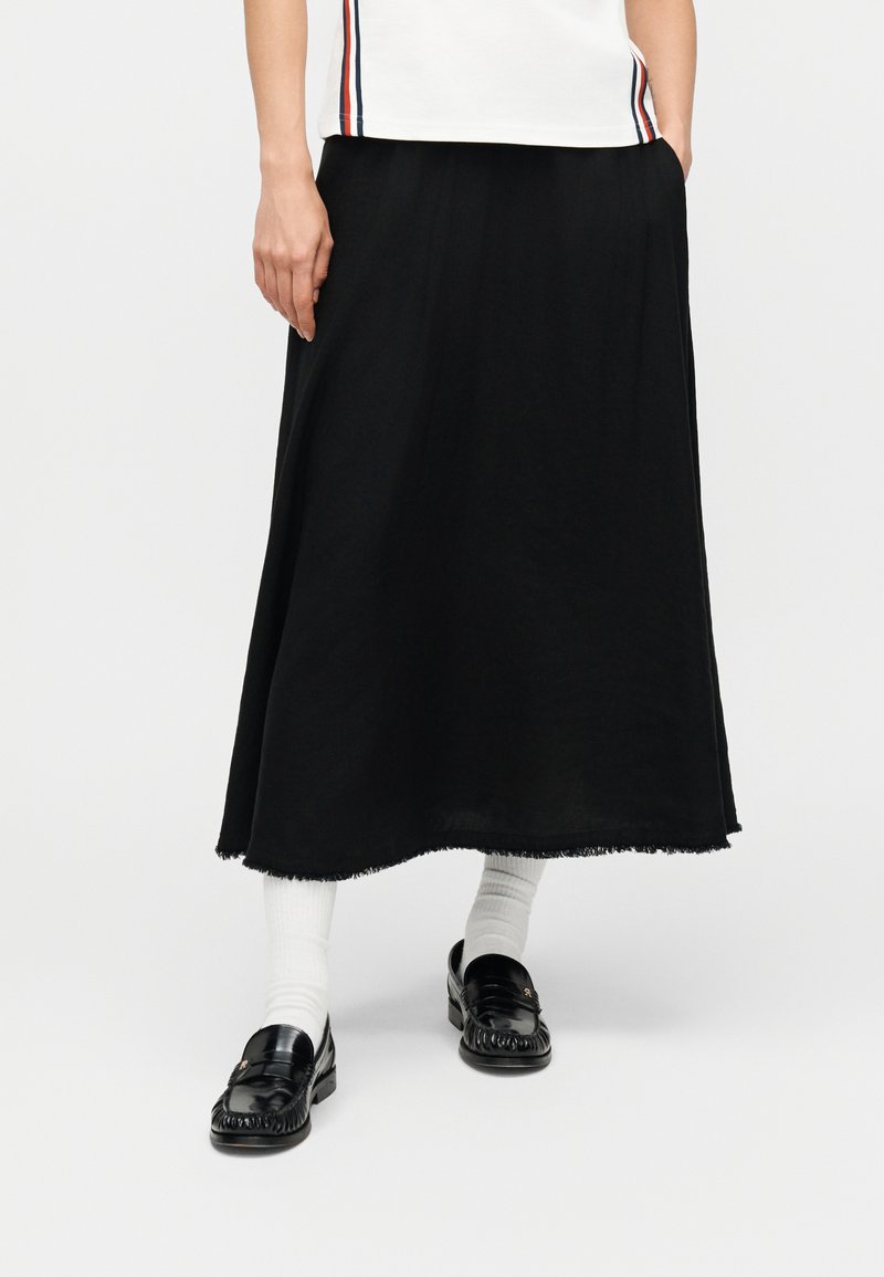 Przeżyjcie ciepłe dni w tej obszerniej plisowanej spódnicy o kroju litery A, wykonanej z przewiewnej mieszanki lnu z metalowymi flagami.Najważniejsze cechy • Mieszanka lnu • Kontrastowe szwy w pasie • Plisy z przodu • Dwie boczne kieszenie • Logo Tommy Hilfiger • Metalowa flaga Tommy Hilfiger na dole Spódnica Kształt i dopasowanie • Luźny krój • Kształt litery A • Długość midi • 81 cm od talii do dołu (w rozmiarze S) Skład i pielęgnacja • 53% len, 47% wiskoza