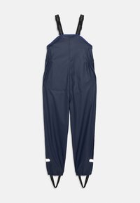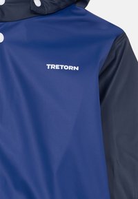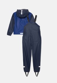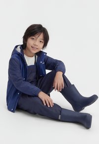 Małe dziecko o ciemnych włosach ubrane w niebieską kurtkę przeciwdeszczową, wodoodporne spodnie i niebieskie kalosze, siedzące na podłodze i uśmiechające się.