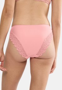 Różowe majtki wykonane z gładkiej tkaniny, z koronkowymi akcentami na biodrach. Fason o średnim stanie z bezszwowym wykończeniem dla komfortu.