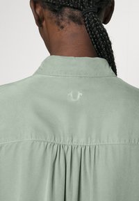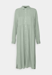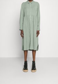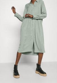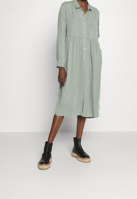 Jasnozielona sukienka koszulowa z długim rękawem, kołnierzykiem, zapięciem na guziki z przodu, marszczoną talią i bocznymi rozcięciami. W zestawieniu z czarnymi botkami za kostkę.