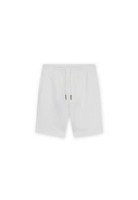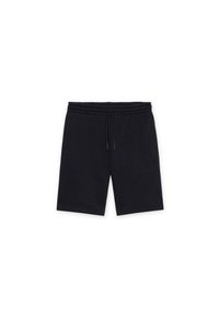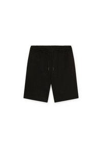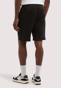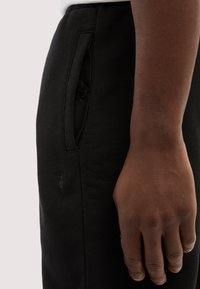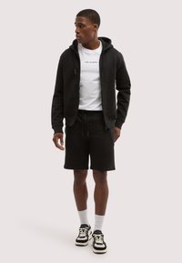 Mężczyzna ubrany w czarne spodenki ze sznurkiem, białe skarpetki za kostkę oraz czarno-białe sneakersy, stojący na jednolitym tle.