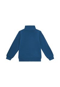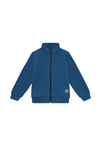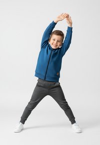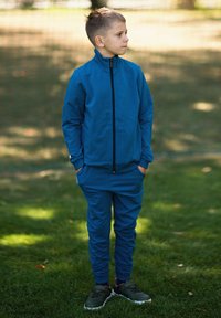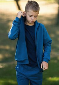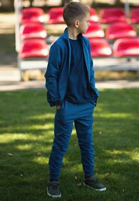 Niebieska kurtka na zamek z wysokim kołnierzem, szare spodnie dresowe i białe trampki. Strój ma małe logo na kurtce.