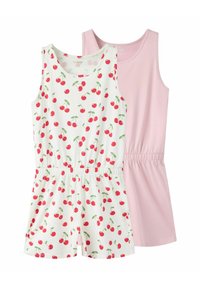 Dwa bezrękawnikowe kombinezony: jeden w print w panterę z elastycznym pasem, a drugi w kolorze jednolitym czarnym. Oba wykonane z miękkiego, oddychającego materiału.