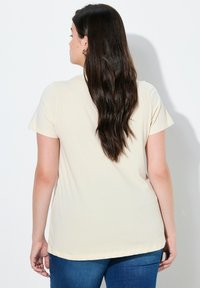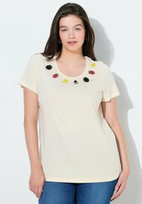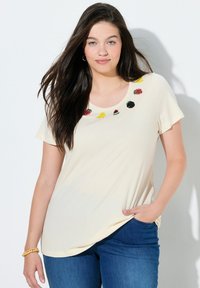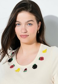 Kobieta o długich ciemnych włosach, ubrana w kremową koszulkę z krótkim rękawem, ozdobioną haftowanymi motywami owoców wokół dekoltu oraz niebieskie dżinsy.