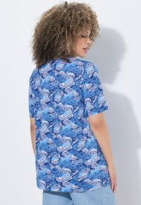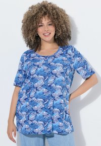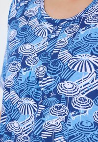 Kobieta o kręconych włosach, uśmiechająca się, ubrana w niebieski top z białym i niebieskim wzorem parasola, stojąca z jedną ręką na biodrze.
