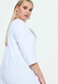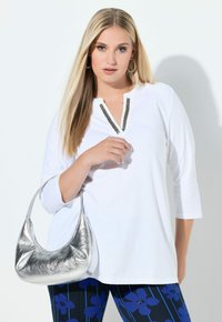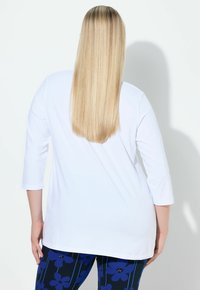 Biały top z długim rękawem, dekoltem w kształcie litery V i ozdobnym wykończeniem. Charakteryzuje się luźnym krojem i gładką bawełnianą tkaniną. Połączony z niebieskimi spodniami w kwiatowy wzór.