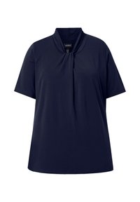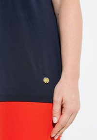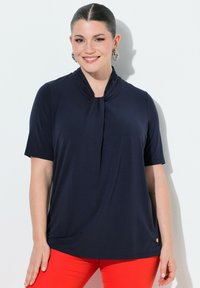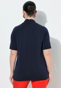 Kobieta z ciemnymi włosami związanymi w kok, ubrana w granatową bluzkę i czerwone spodnie, trzymająca małą brązową torebkę, nosząca srebrne bransoletki i kolczyki.