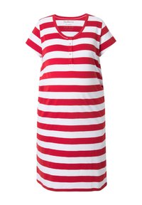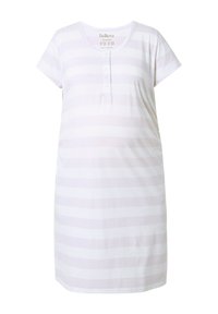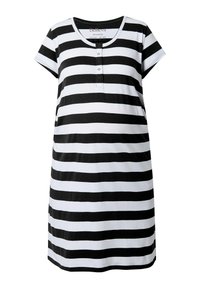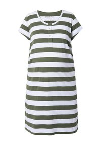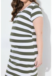 Kobieta stojąca w białej sukience do kolan z oliwkowo-zielonymi poziomymi paskami, krótkimi rękawami oraz białych sandałach na płaskiej podeszwie.