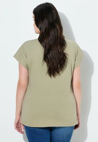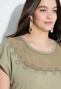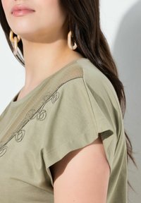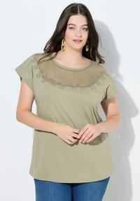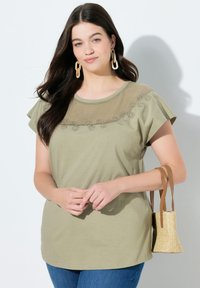 Kobieta o długich ciemnych włosach, ubrana w oliwkowozieloną bluzkę z koronkowym zdobieniem przy dekolcie i niebieskie dżinsy, pozująca na białym tle.