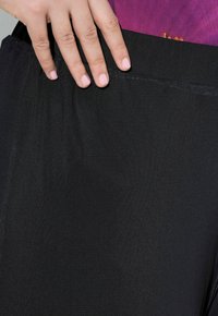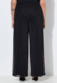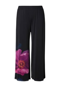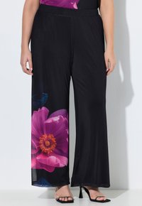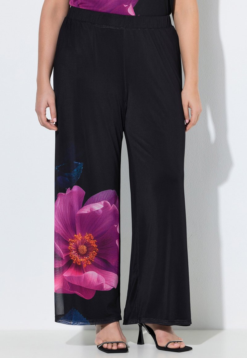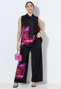 Czarne spodnie o szerokich nogawkach z dużym różowym kwiatowym nadrukiem na lewej nogawce, noszone z czarnymi sandałami na wysokim obcasie i kwiecistą bluzką.
