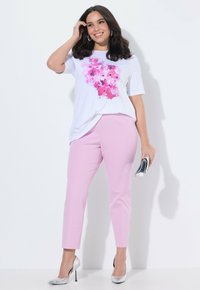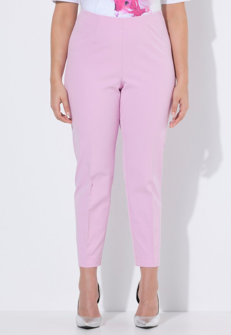 Kobieta ubrana w dopasowane, jasnoróżowe spodnie z wysokim stanem, zestawione ze srebrnymi szpilkami z ostrym noskiem, stojąca na tle białego tła.
