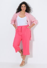 Kobieta w jasnoróżowych, krótkich spodniach z przednimi kieszeniami i ściągaczem w pasie, w połączeniu ze złotymi sandałami na kostkę.