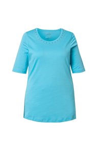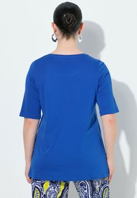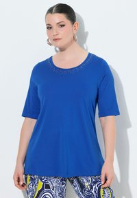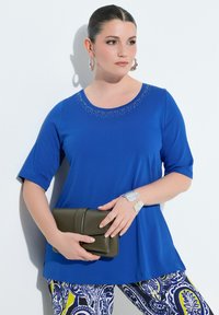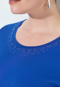 Kobieta o ciemnych włosach w niebieskiej bluzce z krótkim rękawem z drobnymi koralikowymi zdobieniami przy dekolcie, ubrana w niebiesko-żółte spodnie w wzory.