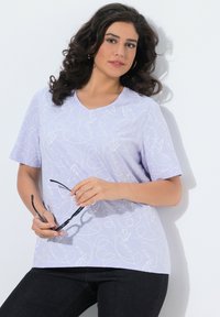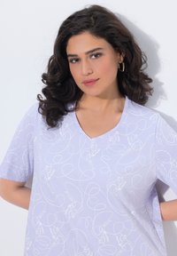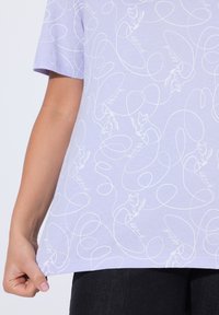 Kobieta o ciemnych, kręconych włosach, ubrana w jasnofioletową koszulkę z dekoltem w serek, ozdobioną białymi, abstrakcyjnymi liniami w kształcie kotów, oraz czarne spodnie.