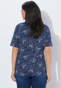 Kobieta w granatowym topie z dekoltem w szpic, ozdobionym białymi abstrakcyjnymi liniami, oraz niebieskich dżinsach, stojąca na białym tle.