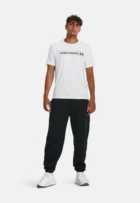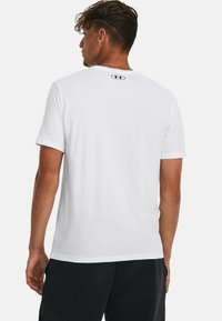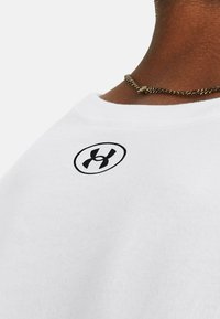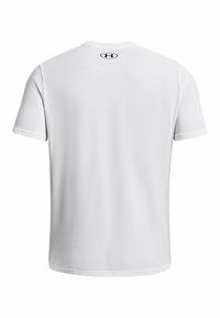 Biała bawełniana koszulka z poziomym czarnym logo "UNDER ARMOUR" z szarymi akcentami. Krótkie rękawy i luźny krój.