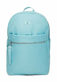 Jasnoniebieski plecak o zaokrąglonym kształcie góry, wyposażony w przednią kieszeń na suwak, wyściełane paski i gładką fakturę tkaniny.