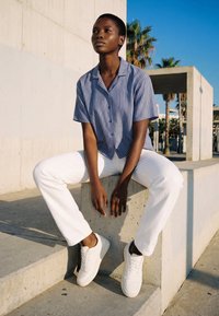 Kobieta stoi na zewnątrz w niebieskiej koszulce w paski z krótkim rękawem, białych spodniach i białych tenisówkach, z rękami w kieszeniach, betonowe konstrukcje w tle.