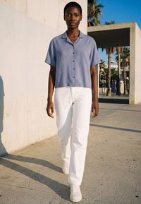 Koszula na guziki z teksturowanej jasnoniebieskiej tkaniny. Ma krótkie rękawy, kołnierzyk, kieszeń na piersi oraz brązowe guziki.