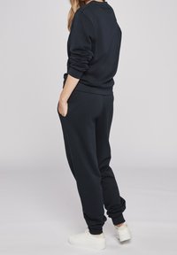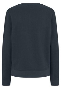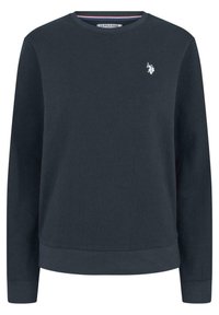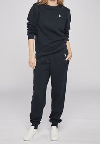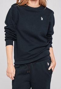 Granatowy sweter z miękkiego materiału, z okrągłym dekoltem i luźnymi rękawami. Małe białe logo na piersi, w zestawie z pasującymi dresami.