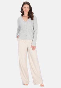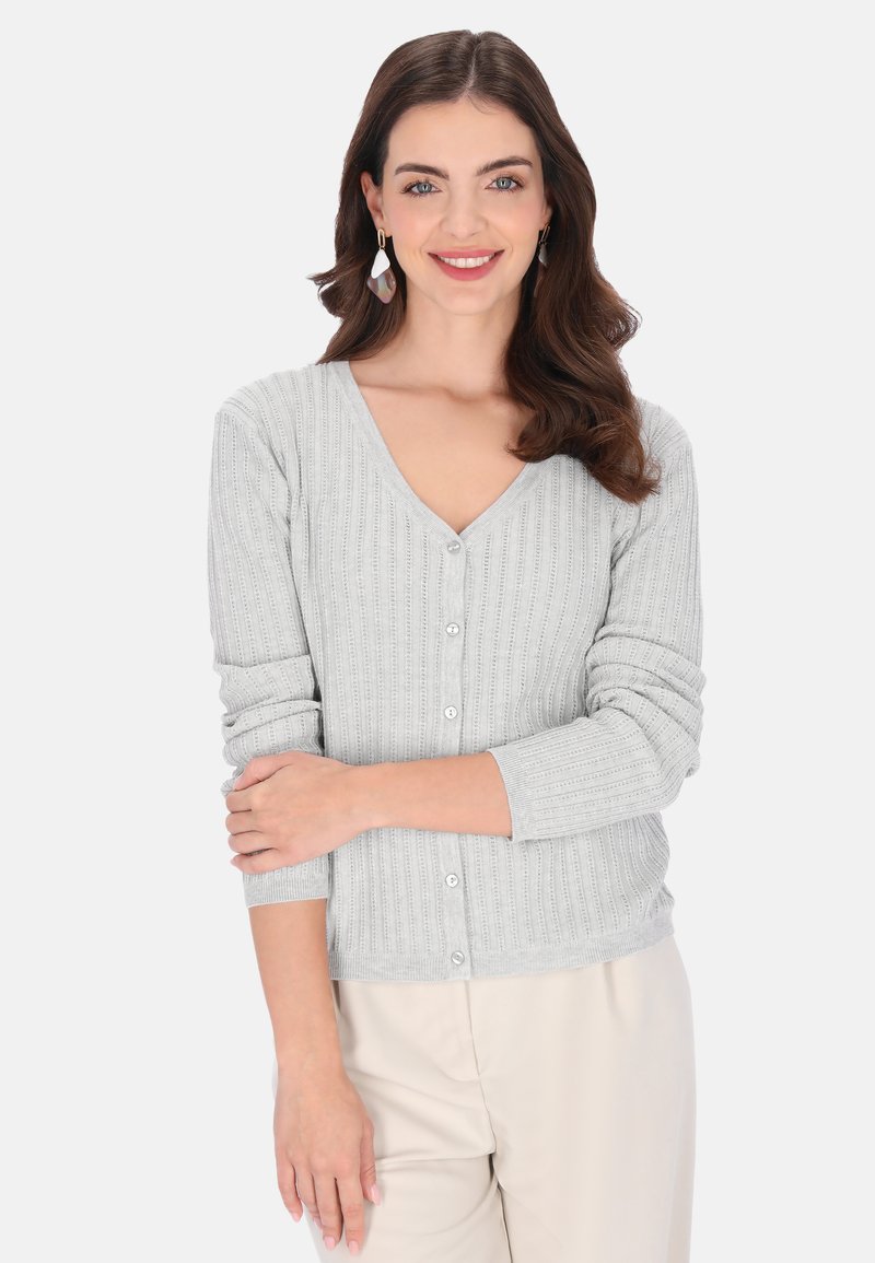 Szary prążkowany kardigan z dekoltem w serek i długimi rękawami, z zapięciem na guziki. Gładka faktura i dopasowany krój.