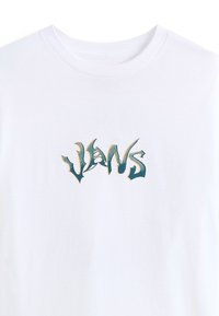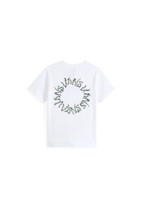Biała bawełniana koszulka z grafiką logo w zielonym i niebieskim kolorze, umieszczoną na środku klatki piersiowej, z krótkimi rękawami i okrągłym dekoltem.