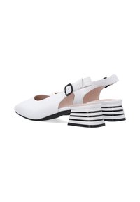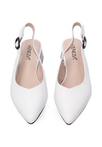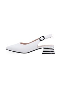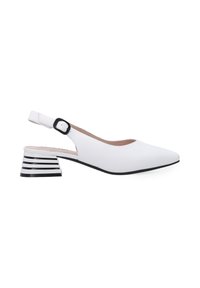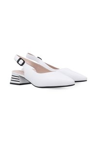 Białe skórzane szpilki slingback z wąskim noskiem i umiarkowanym słupkowym obcasem. Posiadają regulowany pasek wokół kostki i gładką teksturę.
