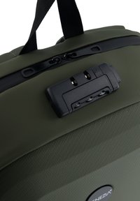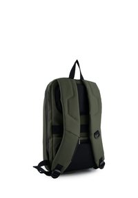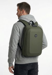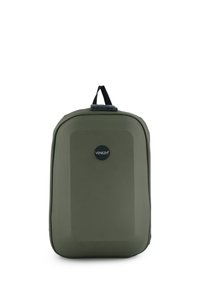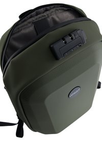 Plecak w kolorze zielonym, wykonany z wysokiej jakości, trwałego materiału, łączy nowoczesny design z funkcjonalnością na co dzień i w podróży. Z przodu posiada usztywniony korpus z wytrzymałego tworzywa, który skutecznie chroni zawartość i nadaje całości minimalistyczny, nowoczesny wygląd. Plecak zapinany jest na dwubiegowy, zakryty suwak z systemem kodowania, co zwiększa bezpieczeństwo przechowywanych rzeczy. Wnętrze zostało zaprojektowane z myślą o dobrej organizacji - znajduje się tam kilka praktycznych kieszeni, w tym miękka przegroda na laptop oraz uchwyt na bidon i na długopisy. Komfort noszenia zapewniają profilowane plecki z siatkowymi panelami i miękkim wypełnieniem, które poprawiają wentylację. Dodatkowym atutem jest uchwyt do mocowania plecaka na walizce, idealny podczas podróży.