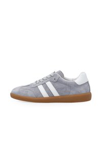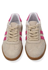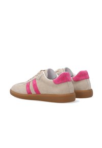 Osoba ubrana w jasnoniebieskie dżinsowe szorty, różową bluzkę i beżowe trampki z różowymi paskami, stojąca na tle białego tła.