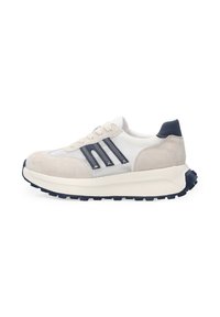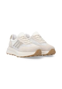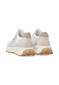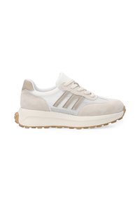 Biało-beżowy sportowy tenisówka z panelami z siateczki, zamszowymi nakładkami, wyściełanym kołnierzem oraz gumową podeszwą z teksturowanym bieżnikiem zapewniającym przyczepność.