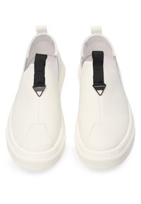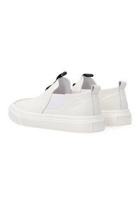 Biała wsuwana tenisówka z elastycznymi panelami po bokach, czarną pętelką na języku i białą gumową podeszwą, pokazana z boku na białym tle.