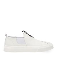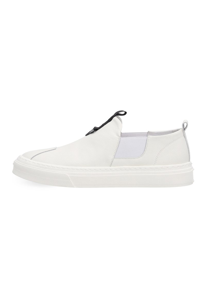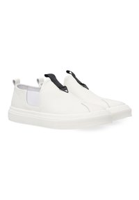 Sneakersy męskie wykonane z naturalnej skóry w białym kolorze. Cholewka o prostej, nowoczesnej formie została uzupełniona elastycznymi wstawkami po bokach, które ułatwiają zakładanie i dopasowanie do stopy. Wsuwany fason podkreśla minimalistyczny charakter modelu, a ozdobny pasek z uchwytem na języku stanowi subtelny detal. Z tyłu umieszczono niewielką pętlę ułatwiającą zakładanie. Całość osadzona na grubszej, jednolitej podeszwie, która nadaje modelowi współczesny wygląd.