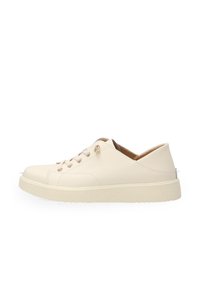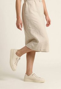 Dolna część ciała ubrana w beżową spódnicę midi oraz kremowe sneakersy sznurowane, jedna stopa lekko uniesiona nad ziemią.