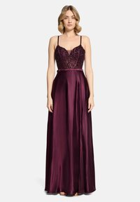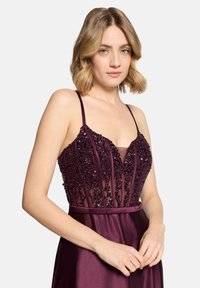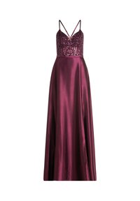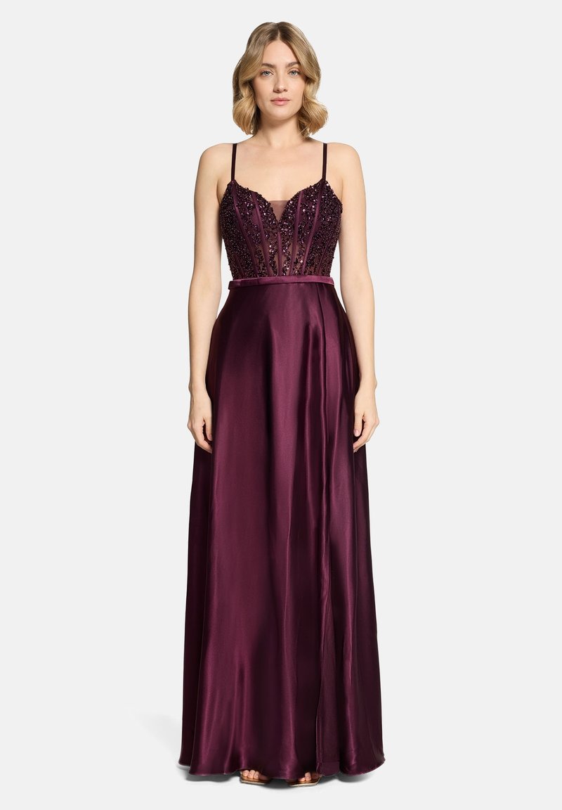 Kobieta ubrana w długą do podłogi, bezrękawną suknię z ciemnofioletowego satynu z koralikowym gorsetem i cienkimi ramiączkami, stojąca na białym tle.